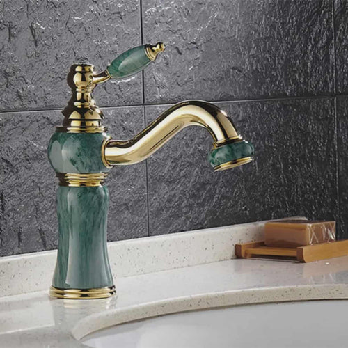 Luxury Deck Mount 3-Hole Gold Plated Bathroom Basin Faucet Mixer with Jade Body