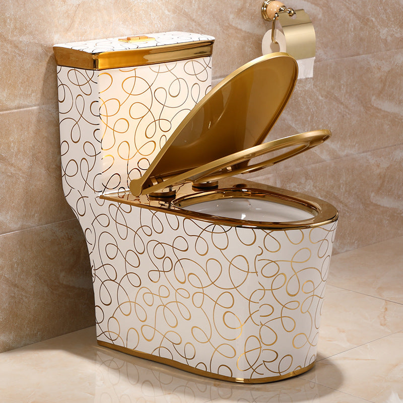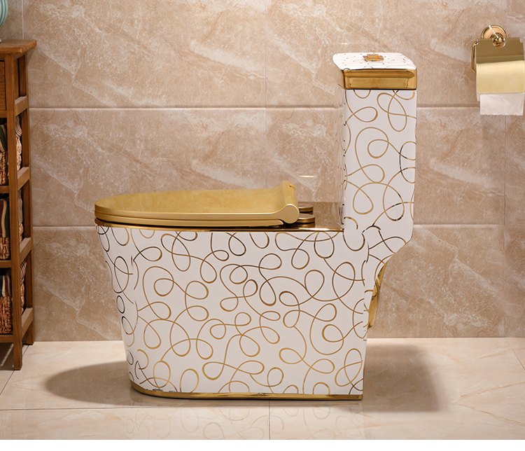 Badezimmerdesign: Keramikbefestigung an der Wand mit goldfarbenem WC, Waschbecken, Sanitärkeramik, Toilettenschüssel
