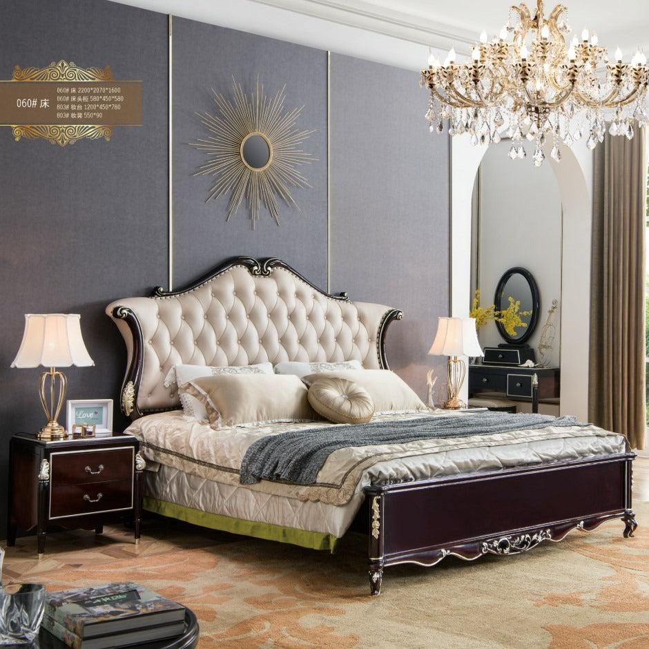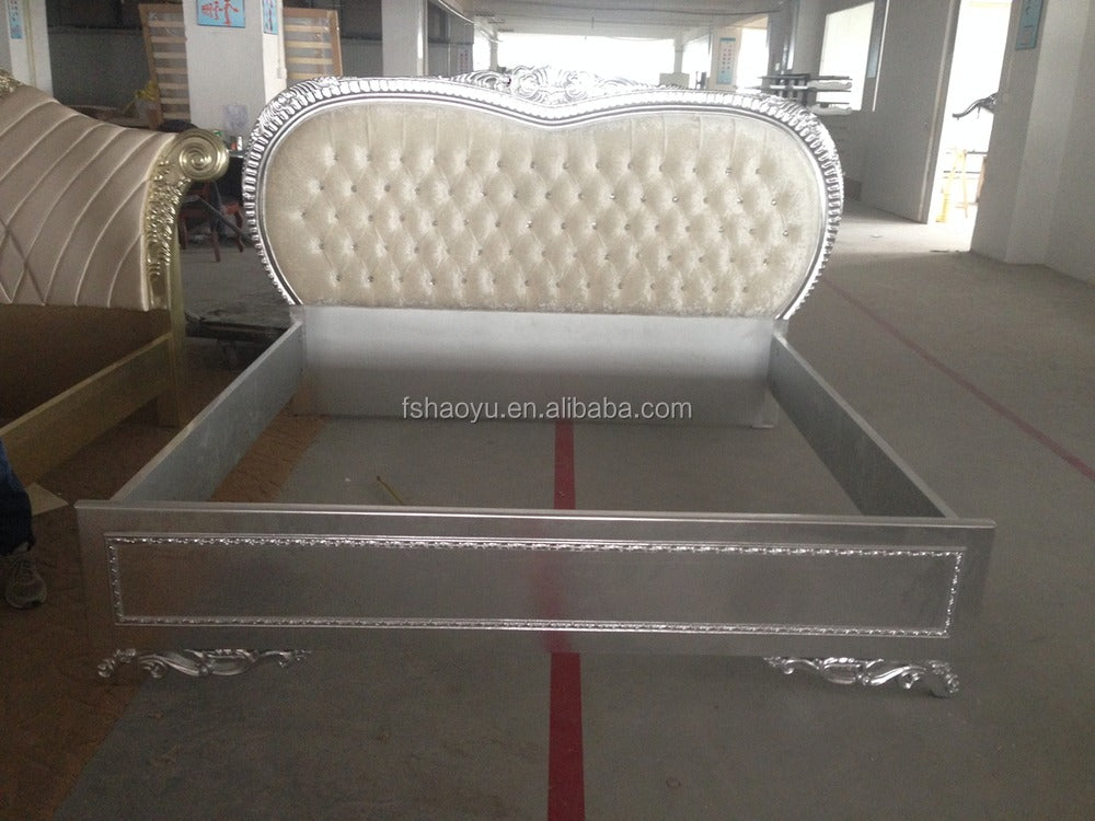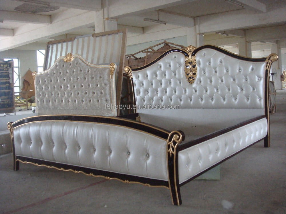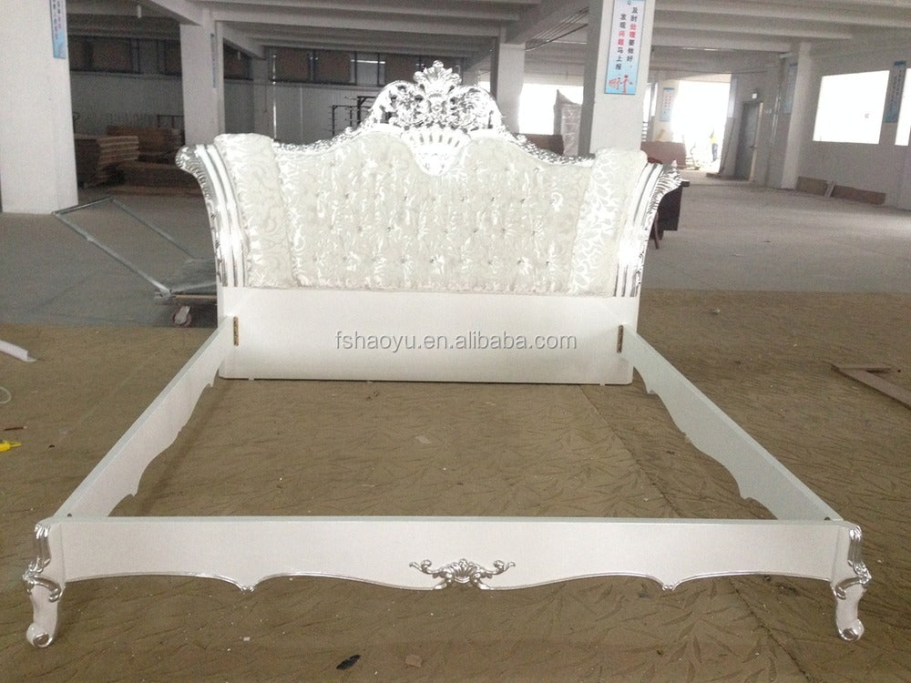 Bettgestell Weiß und Gold, Schlafzimmermöbel, robuste Holzmöbel, Antik, FOSHAN Massivholz, getuftet, Haoyu 180*200 CN;GUA