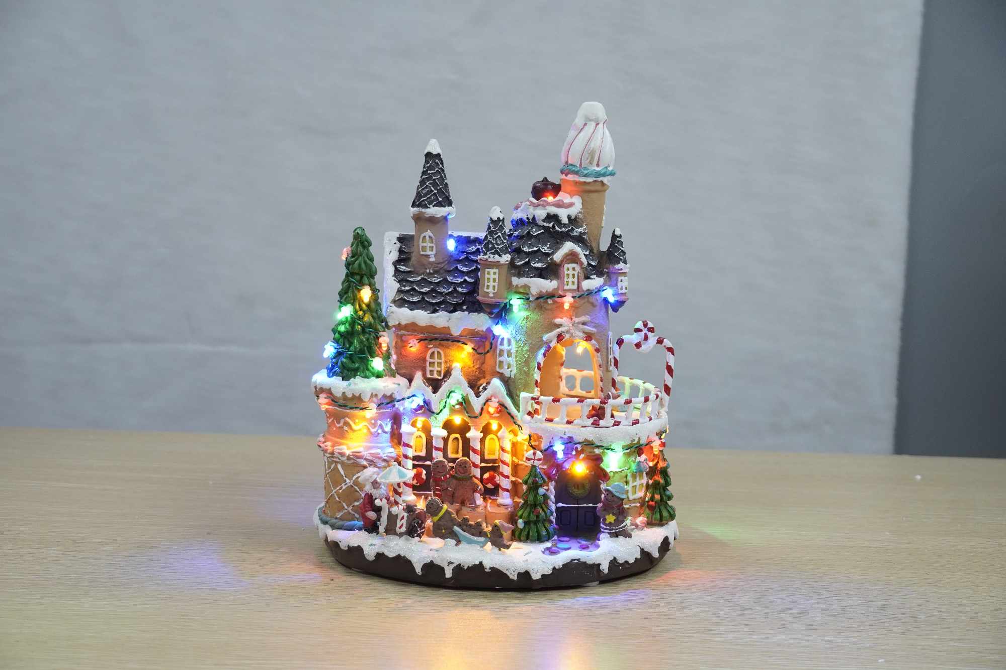 Weihnachtsdekoration: Lebkuchenhaus mit beweglichen Lebkuchenfiguren, beleuchtetes Weihnachtsdorf