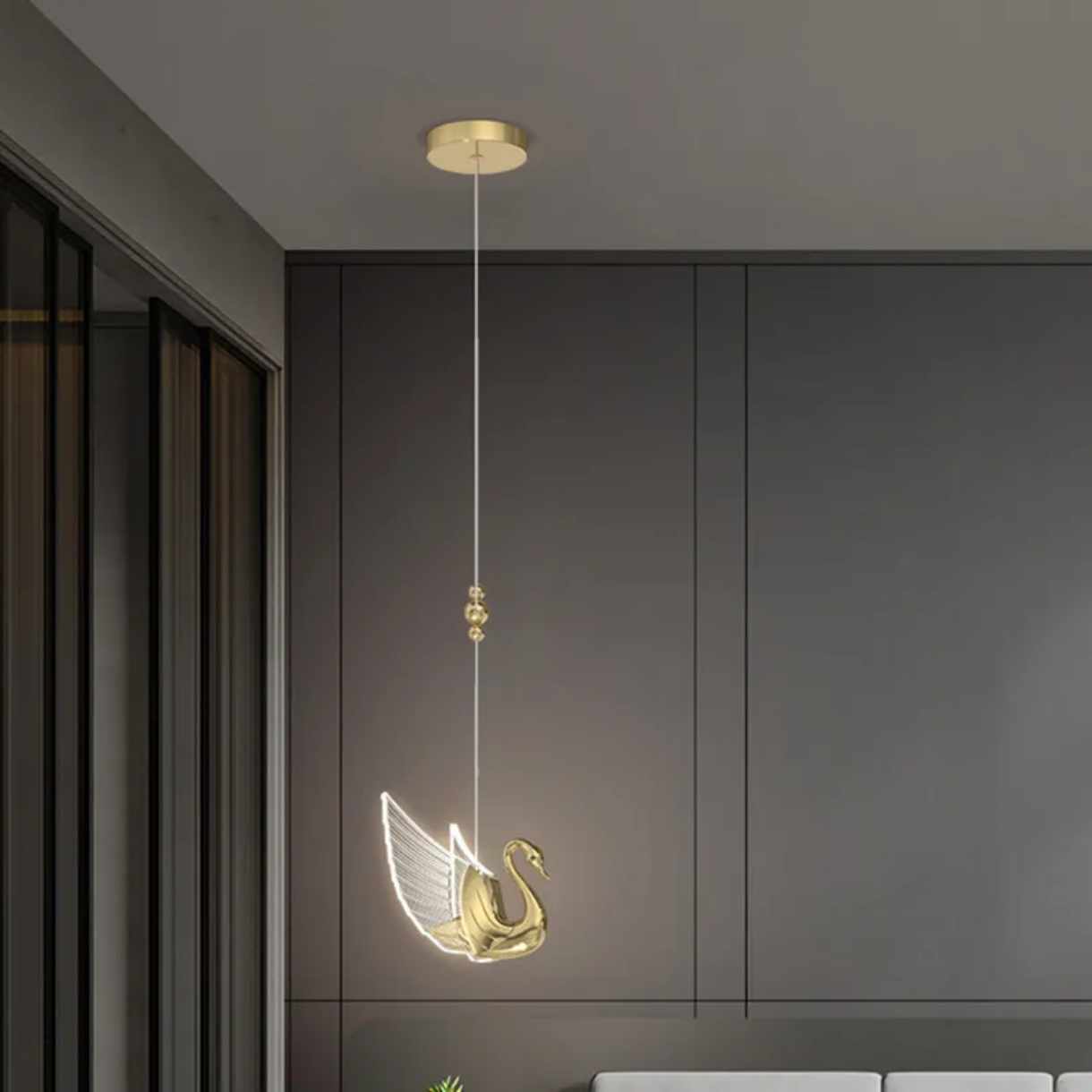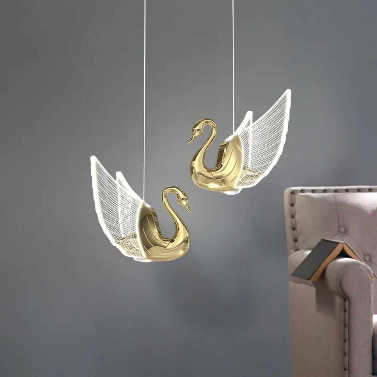 Luxuriöse, moderne LED-Pendelleuchte in Schwanenform, gefertigt aus galvanisiertem Aluminium und Glas, für Wohnzimmer, Schlafzimmer und Hotel.