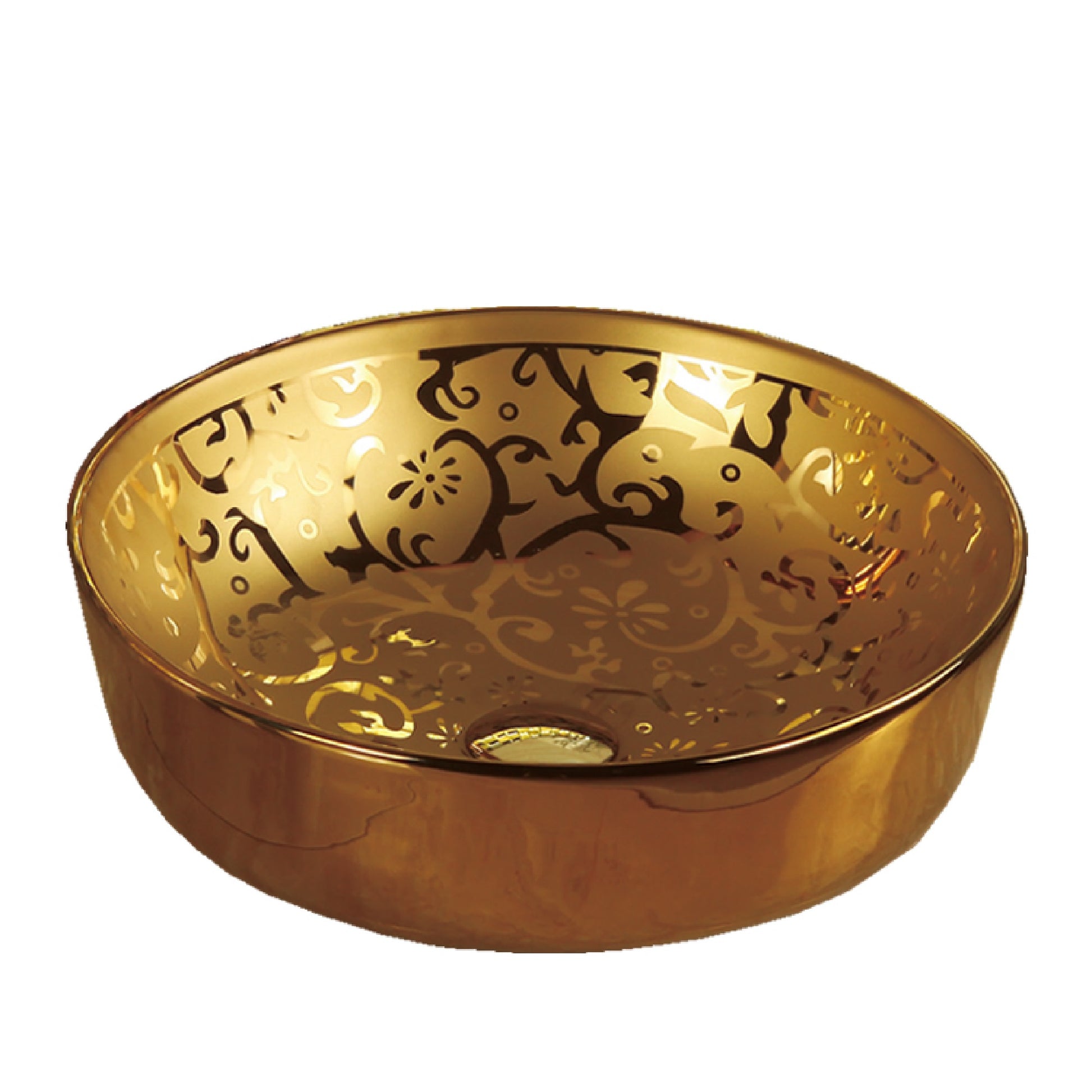 Middle East Style Round Flat Flower Decal Designs Counter Top Sink Ceramic Golden Art Wash Hand Basin