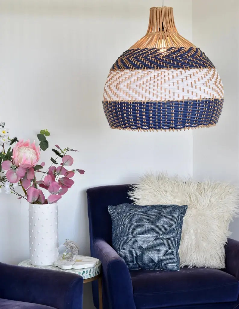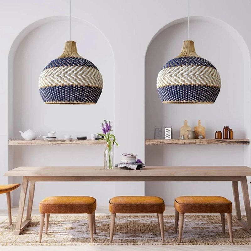 Handgeflochtene Pendelleuchte aus Rattan – Blau-weißer Lampenschirm für moderne Wohnräume und Kronleuchterbeleuchtung