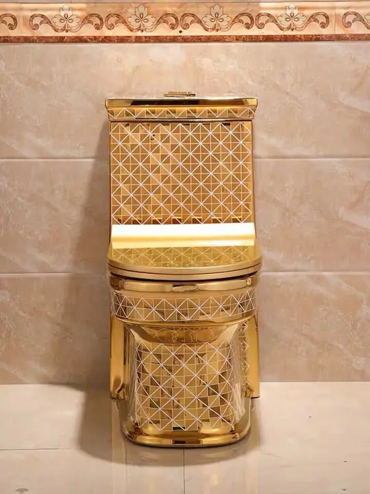 Toilettenschüssel aus galvanisiertem Porzellan mit goldenem, quadratischem Muster und Zweimengenspülung