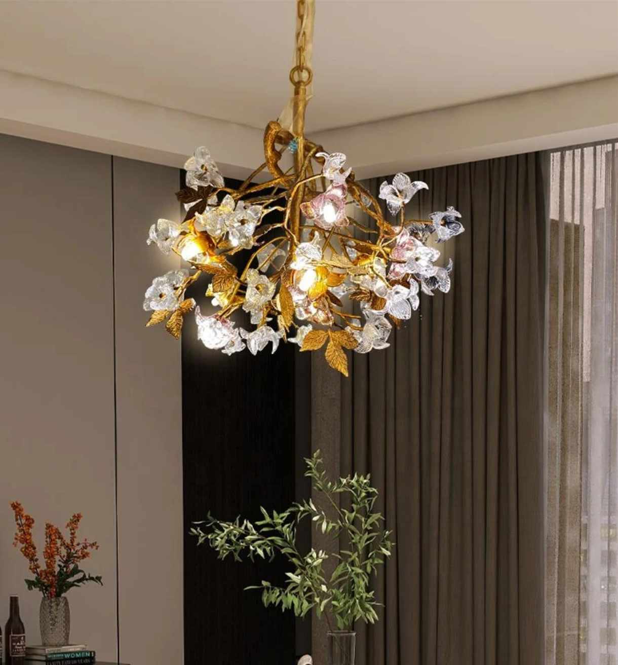 Golden Bloom Cluster A Delicate Chandelier with Crystal Flowers and Twisting Branches Illuminating Elegance and Natural Charm Soft Light Filters Through Petal-Like Glass