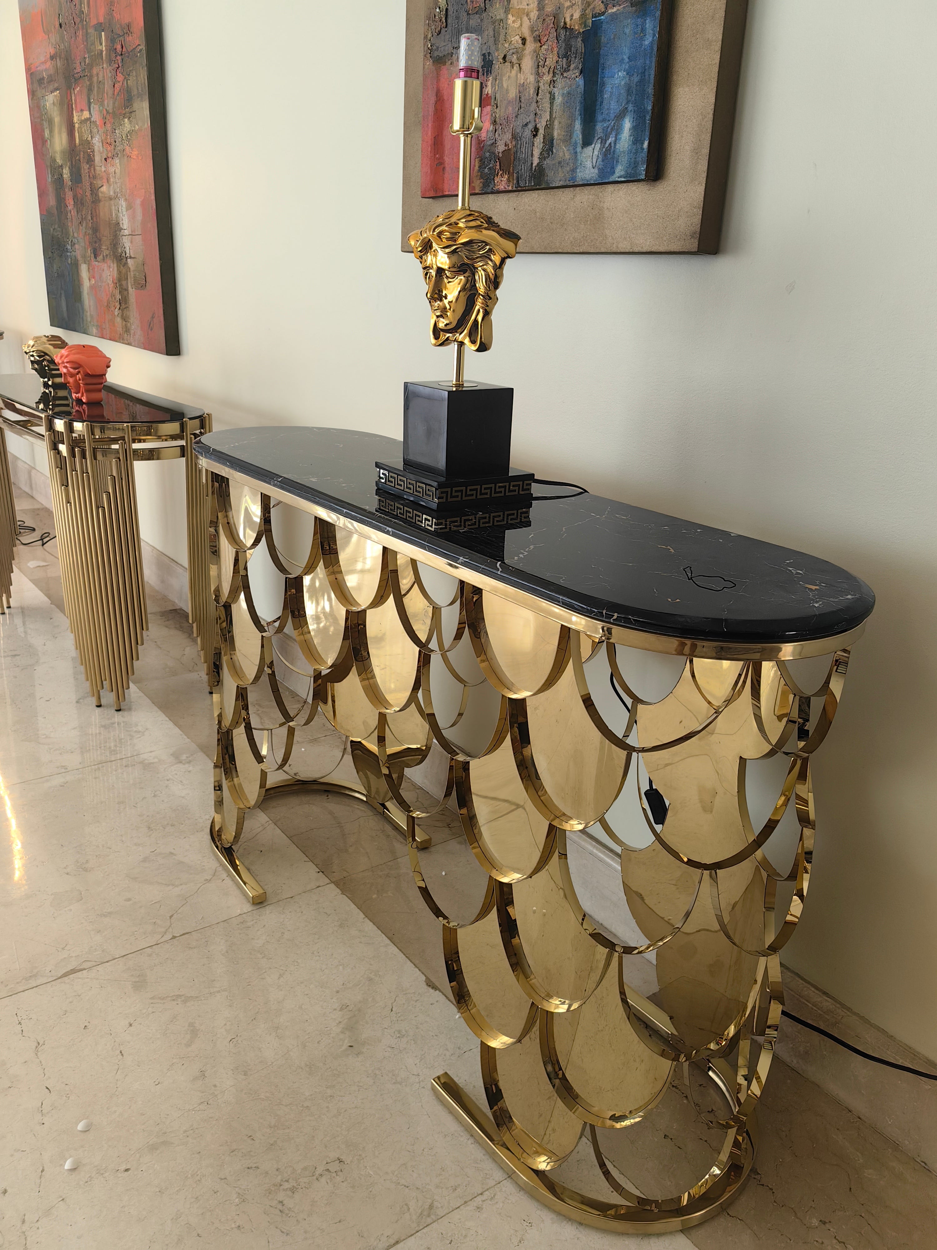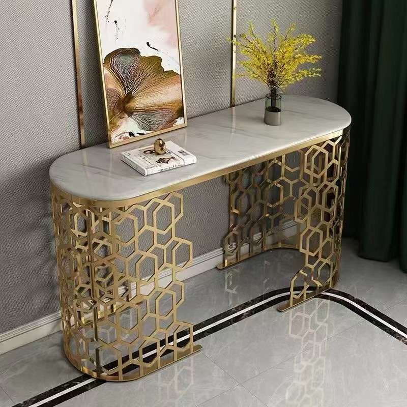 Console Table Crafted with High-Quality Materials Featuring a Lustrous Marble Top and an Intricate Honeycomb Gold Stainless Steel