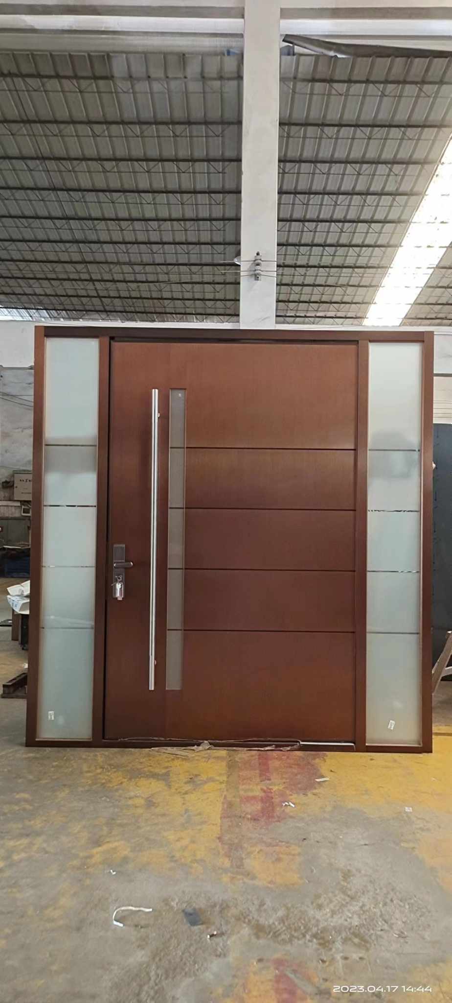 Contemporary Double Door Entrance with Solid Wood Finish, Frosted Glass Side Panels, Stainless Steel Vertical Handle, and High-Security Digital Lock System for Modern Homes
