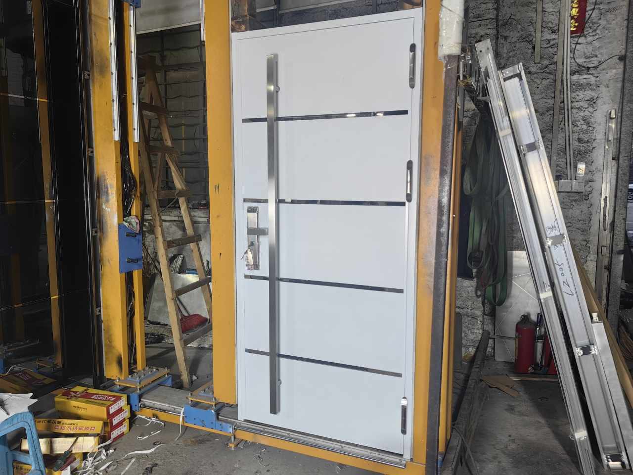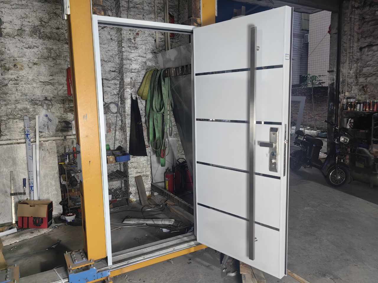 High-Security Modern White Metal Door with Stainless Steel Accents, Fireproof and Soundproof Core, Featuring Advanced Locking System for Residential and Commercial Use and Also hotels.