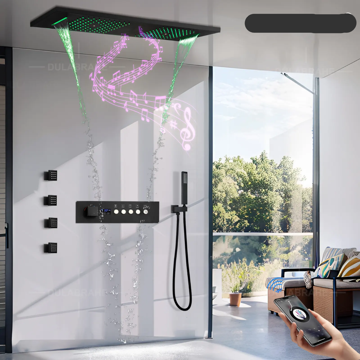 Size: 36x12inches Materials: High-end copper and Stainless steel Color: Black function: Waterfall, Rain Shower, Atomization, Music Player Digital Display, Side... Read more