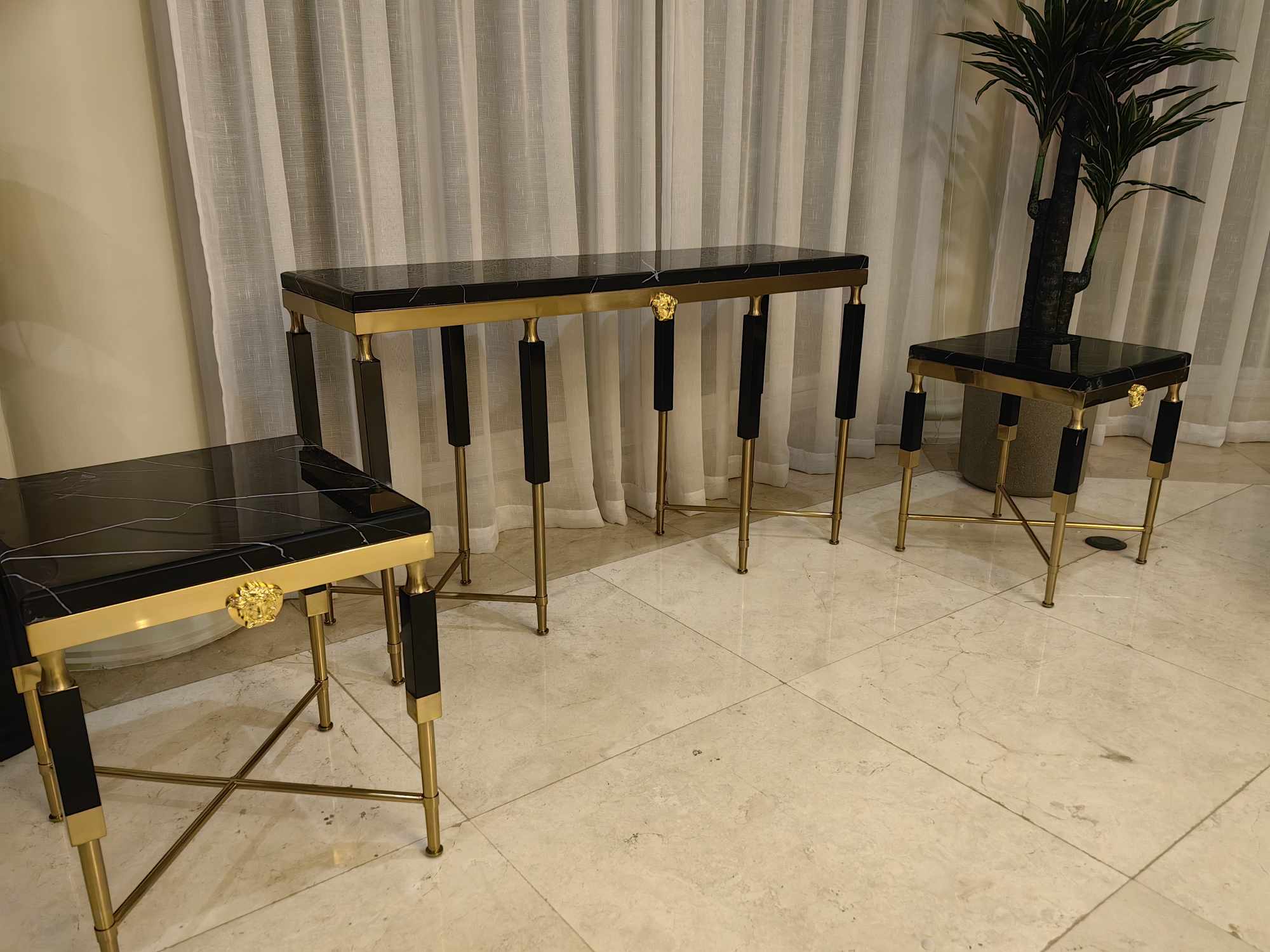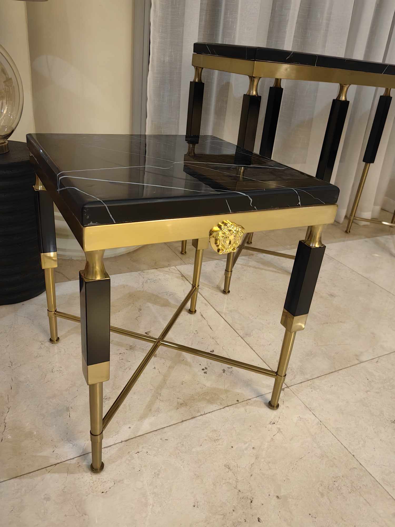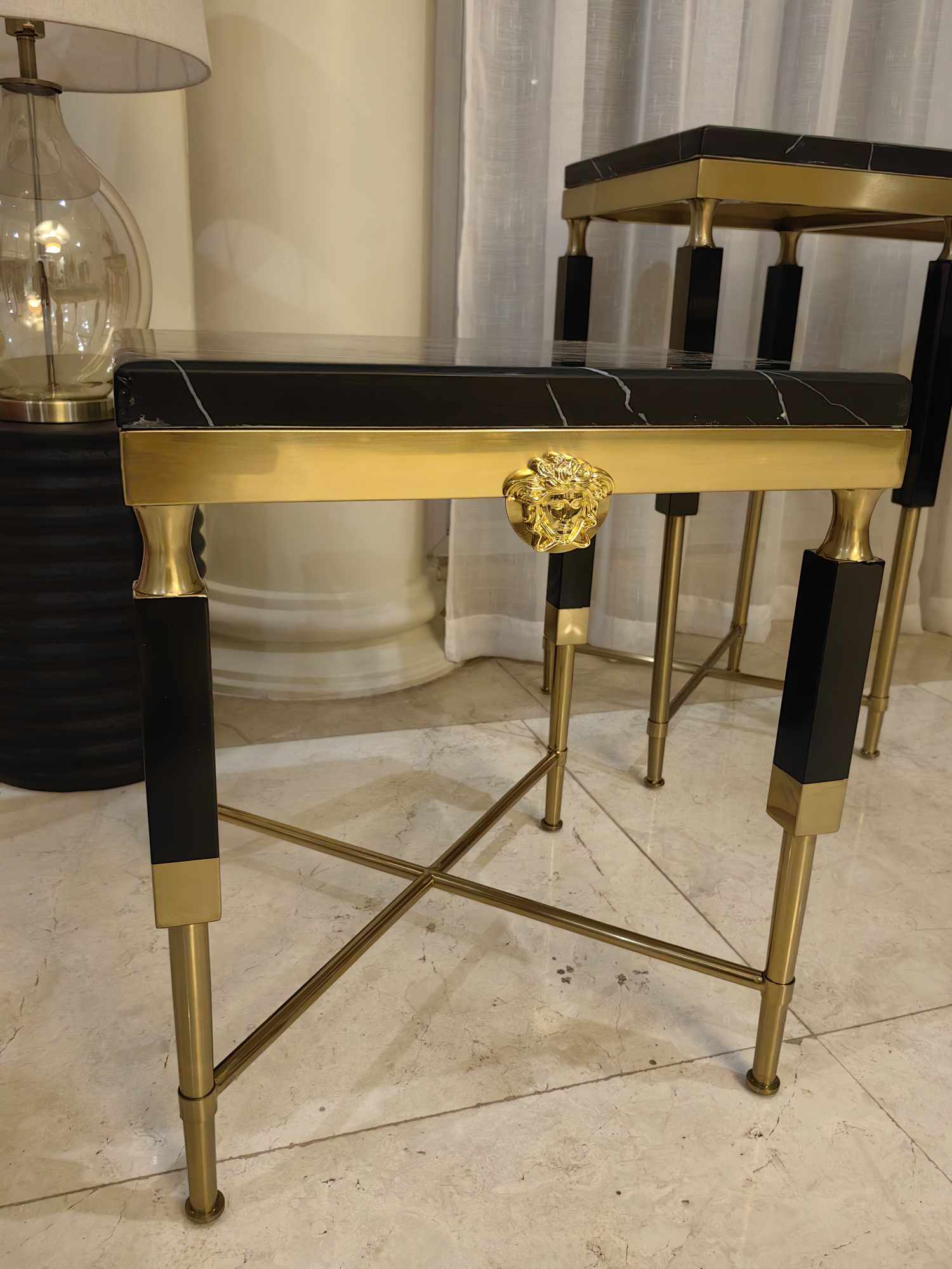 Side Table Polished Marble Seat Gilded Medusa Medallion Detail Geometric Silhouette Refined Opulence Ideal Luxury Interiors