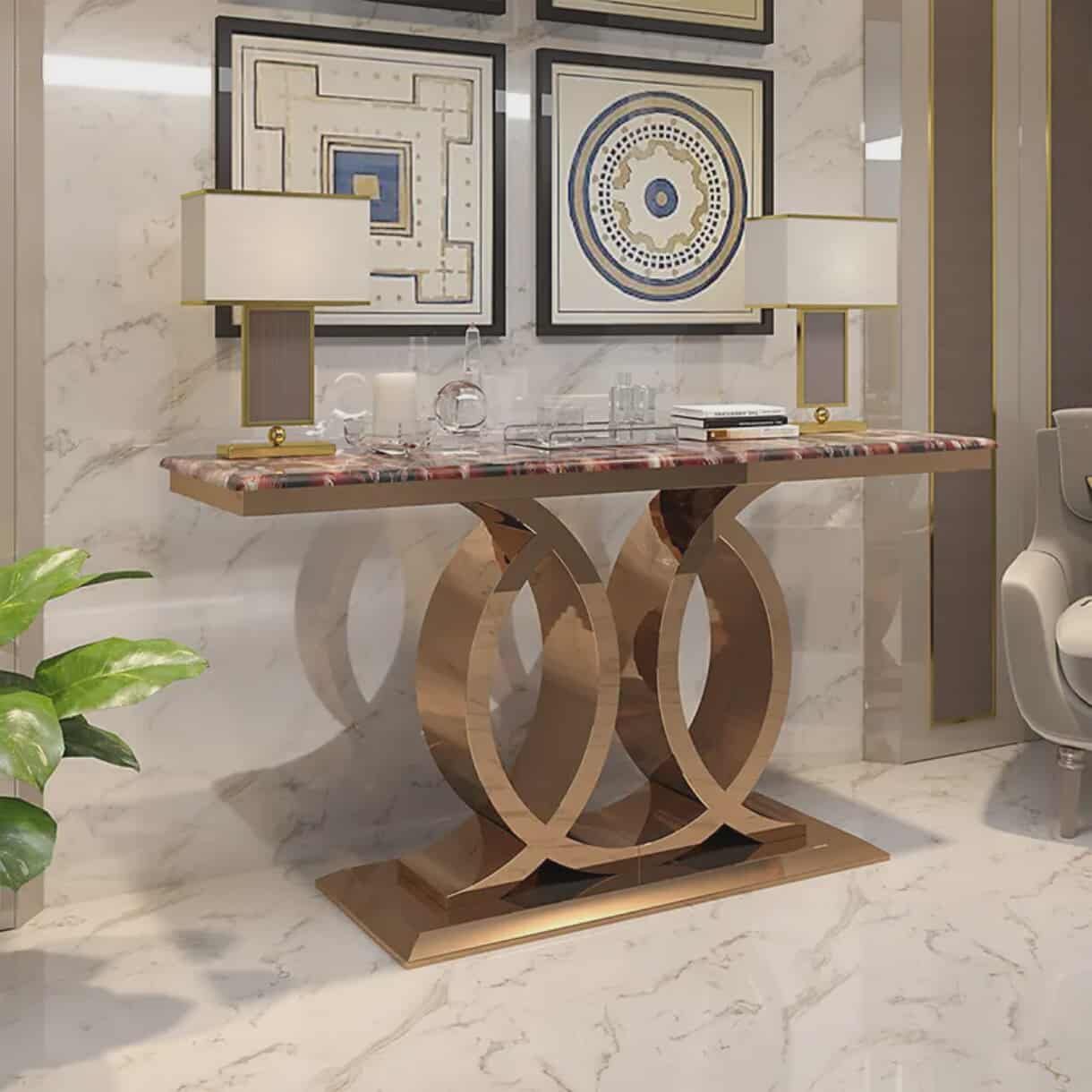Modern Stainless Steel Console Table with Marble Top Rose Gold Finish