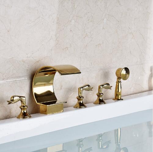 Bathtub Three Handles 5 Pieces Gold Waterfall Shower Faucet With Brass Handheld Spray