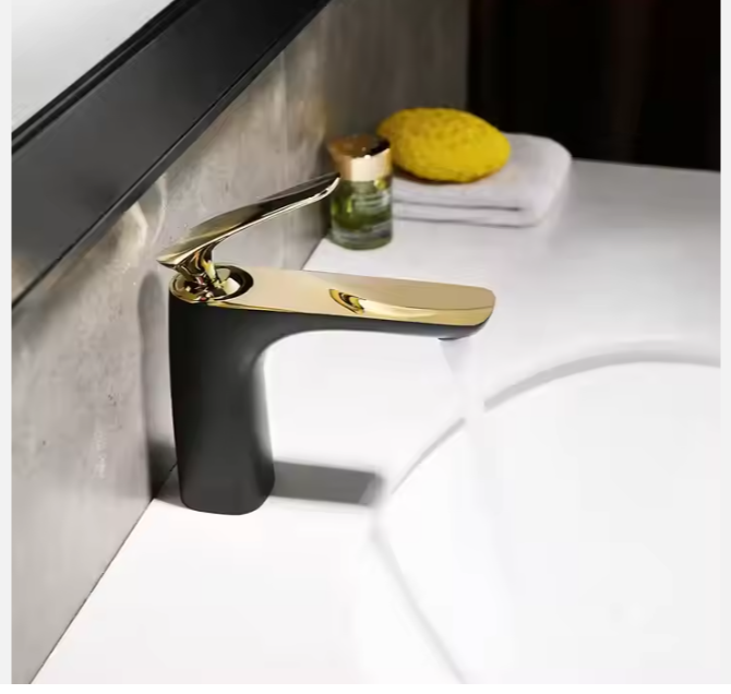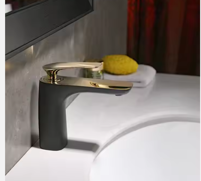 This modern bathroom faucet features a sleek black and gold finish, adding a touch of luxury to any vanity space.... Read more