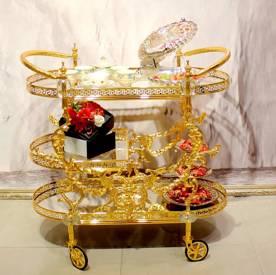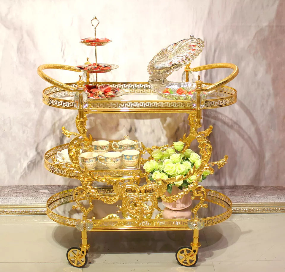European Luxury Custom Carved Dining Cart Hotel Family Trolley Golden Copper Trolley