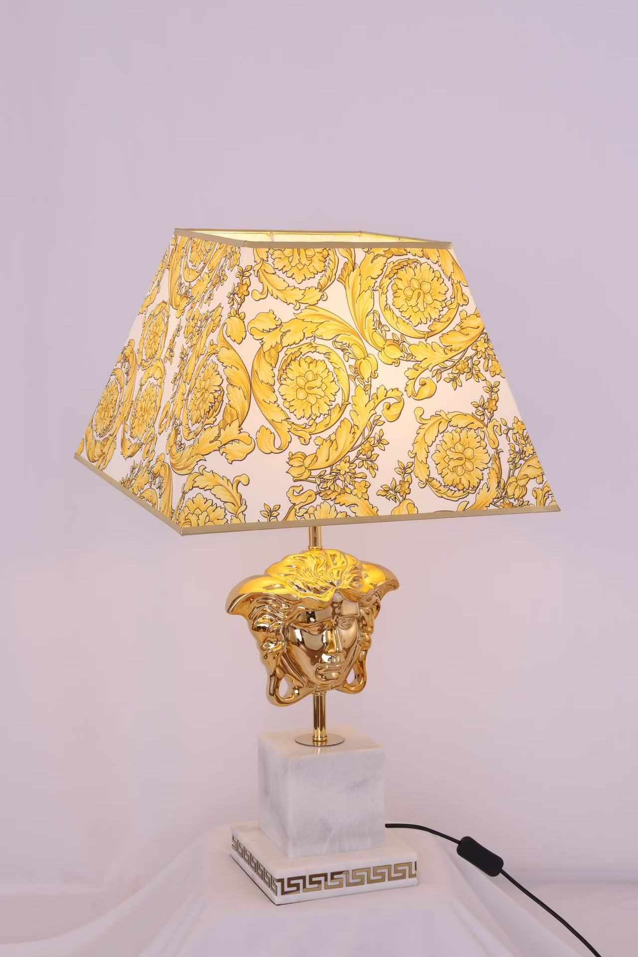 Luxurious Fusion of Classic Versace Design Elements, Featuring the Iconic Medusa Head, Ornate Gold Detailing, and a Baroque-Inspired Black and Gold Lampshade