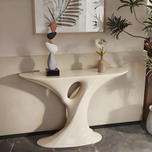 Contemporary Art Fiberglass Cream Console Table with Curved Organic Design and Gloss Finish