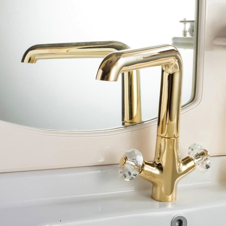 Deck Mounted Dual Crystal Handle Golden Basin Faucet on Stage Basin Sink