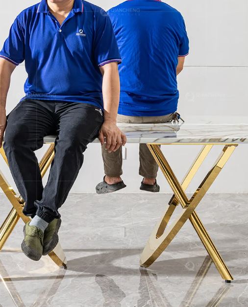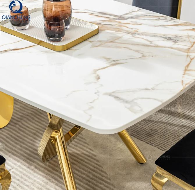 Italian Household Dining Room Furniture Golden Stainless Steel Frame Marble Top Dining Table Set Modern Luxury