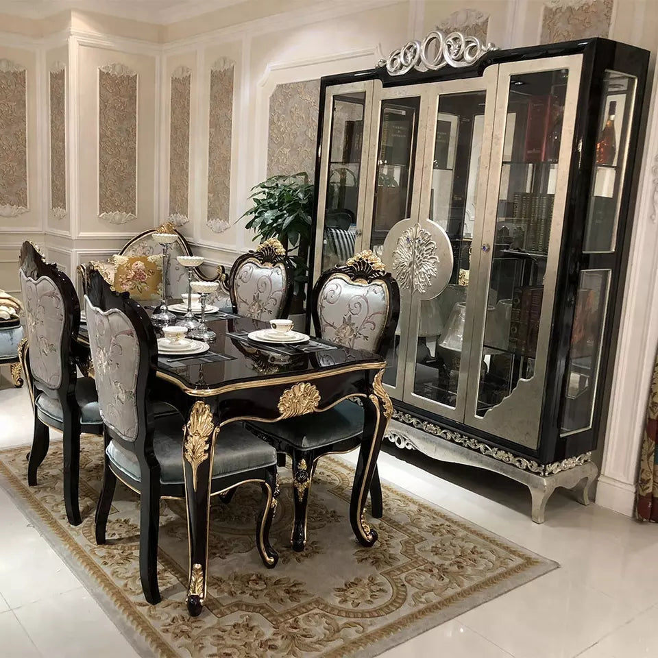 Italian style ebony color dining room furniture with 4 doors display cabinet and fabric dining chair