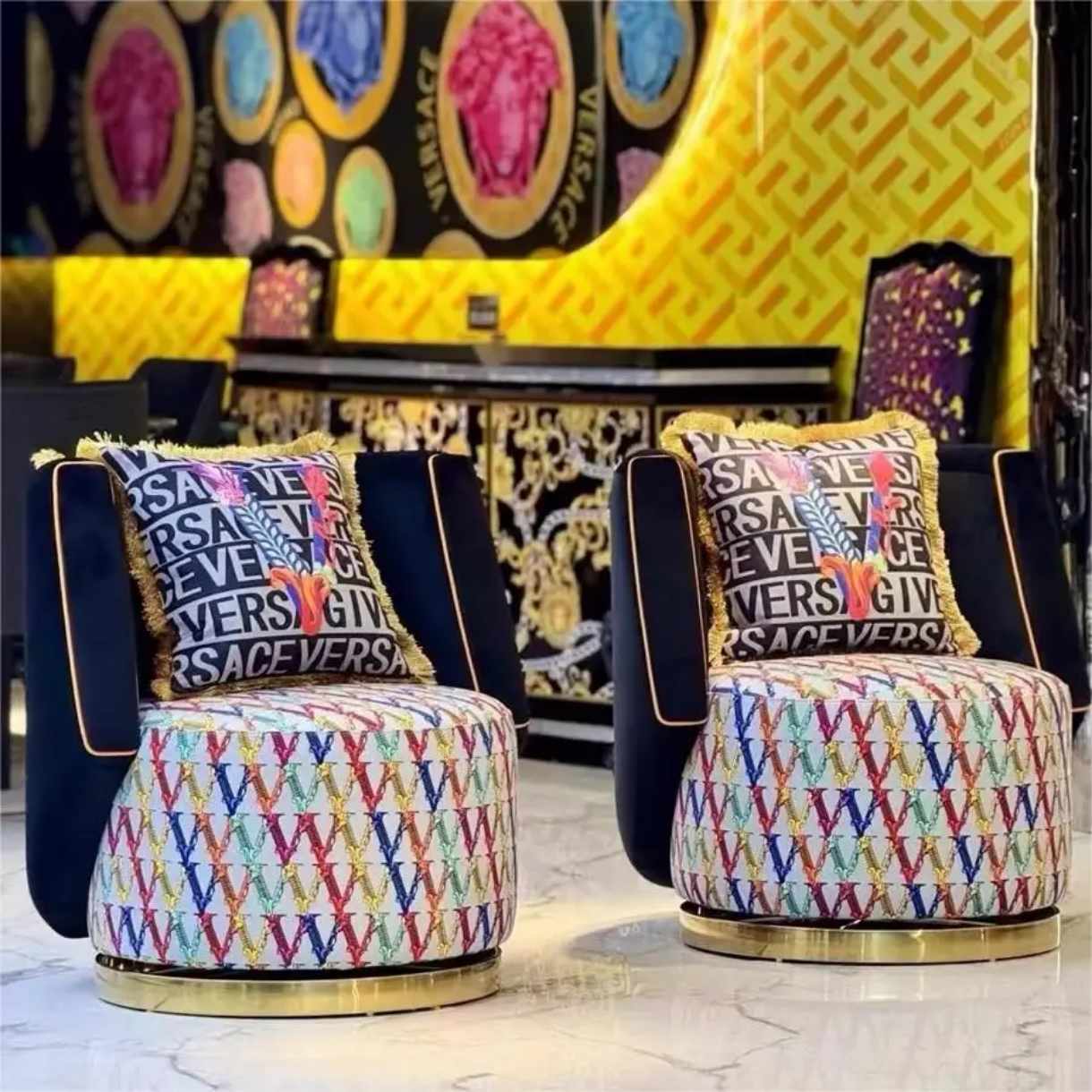 Luxurious Blend of Iconic Versace Style and Modern Comfort, Featuring the Signature Medusa Emblem, Plush Velvet Upholstery, and a Whimsical, Multi-Colored Patterned Base