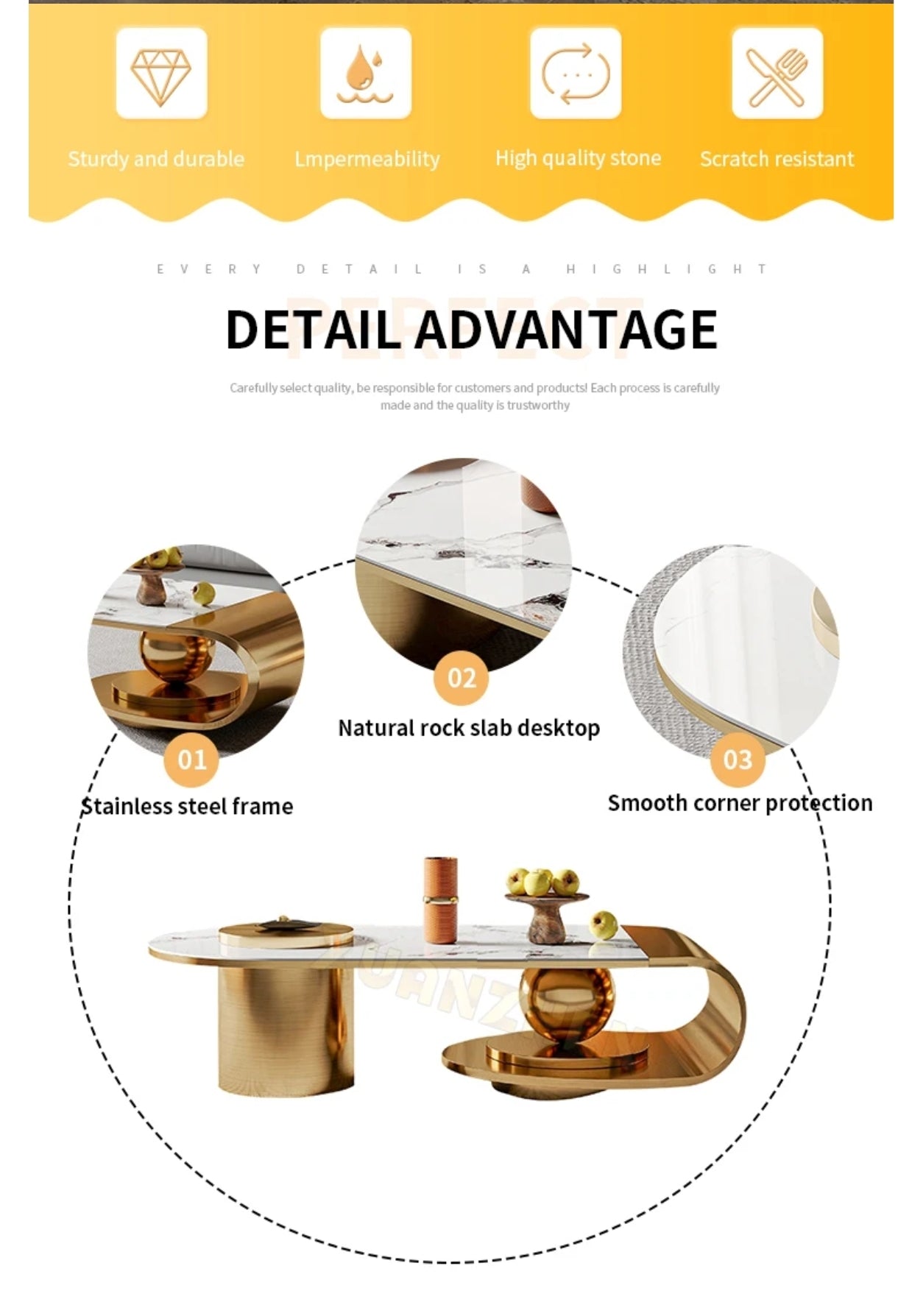 Modern Stainless steel Coffee Table with Marble Top Tea Table