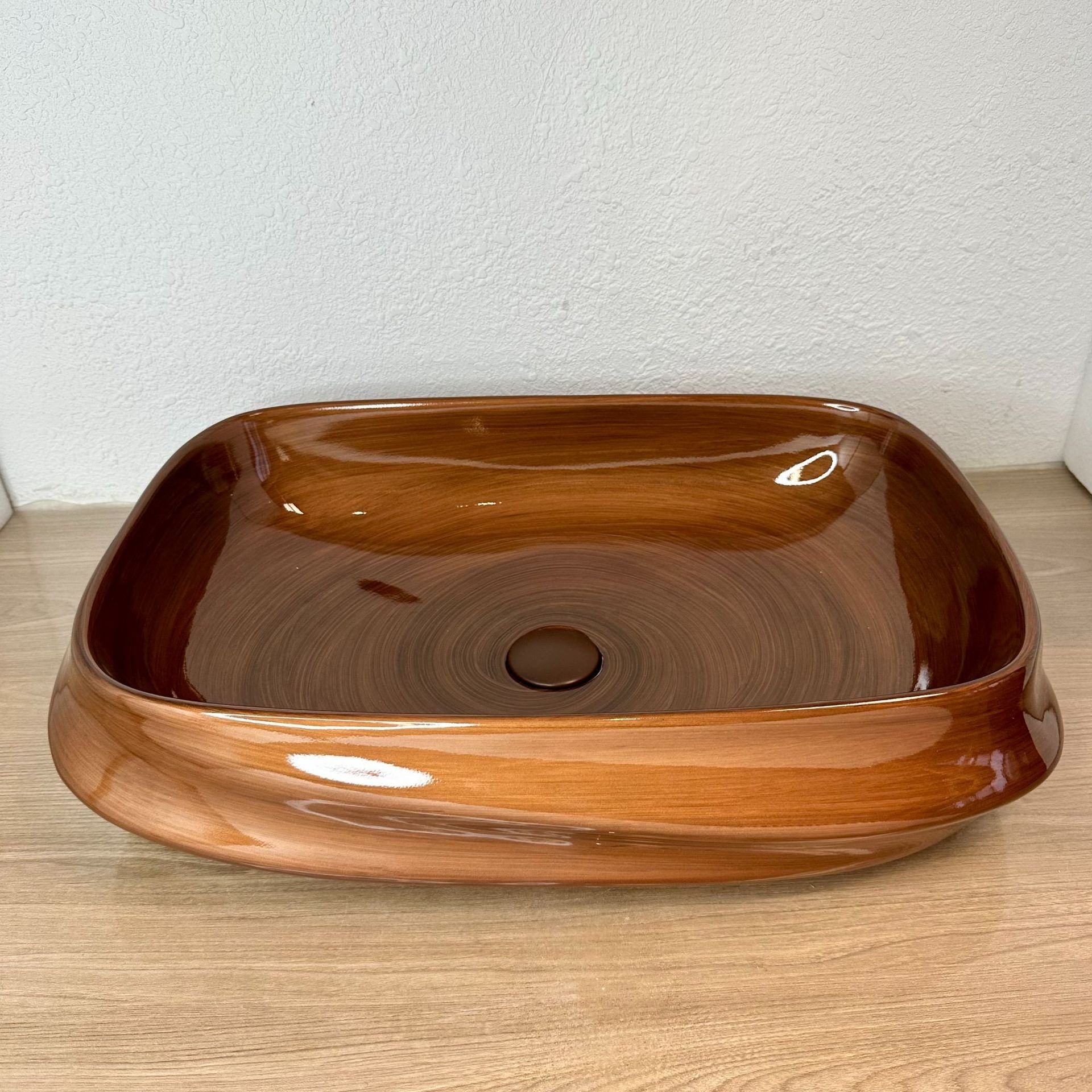 Enhance your bathroom with the warm elegance of this Rectangular Brown Porcelain Bathroom Sink, designed with a unique wood grain effect. Its glossy surface and modern vessel design make it a perfect blend of artistry and functionality, ideal for luxury homes, hotels, and designer interiors.