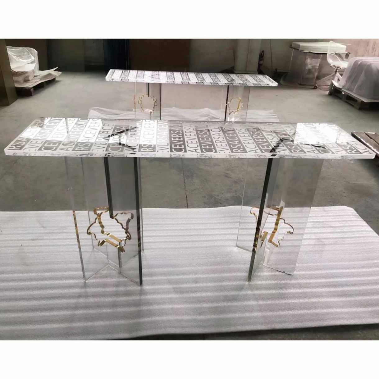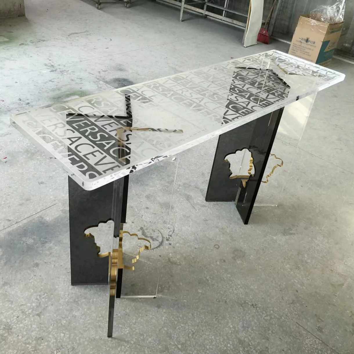 Versace Clear Surface Clarity Table Bold Typography Encased in Crystal Luxury and Contemporary Style Perfect for Elevating High-Fashion Flair A Striking Centerpiece That Captures the Essence of Versace's Iconic Branding