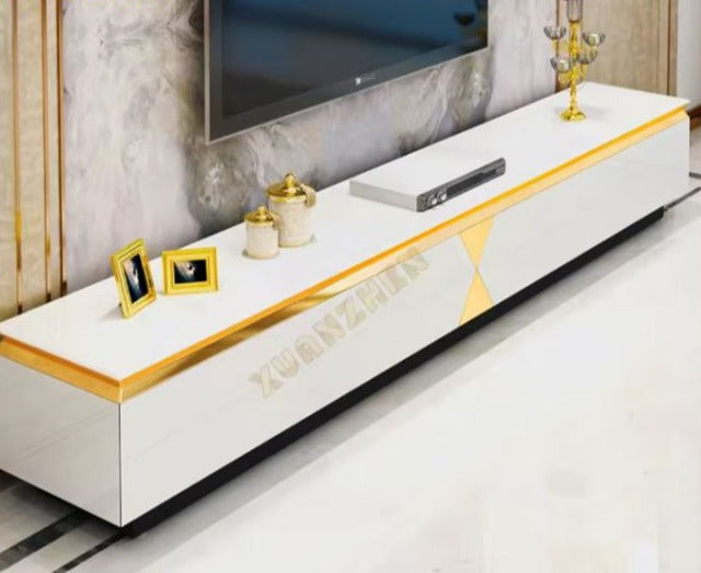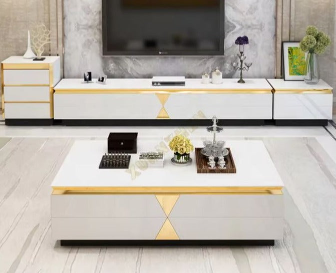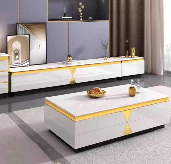 Ensemble de meuble de salon de luxe comprenant un meuble TV/table basse avec tiroirs et finitions en bois et métal.