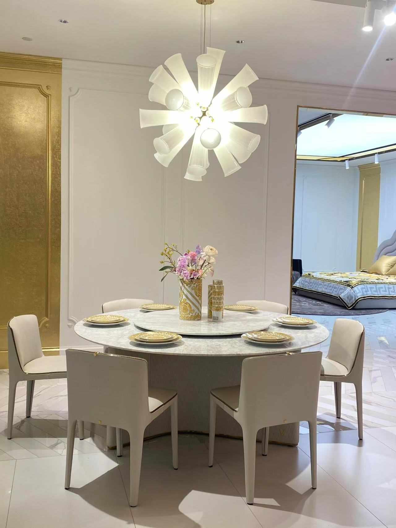 Salle à manger moderne et élégante avec une table ronde en marbre, des chaises blanches rembourrées, de la vaisselle aux accents dorés et un mobilier luxueux.