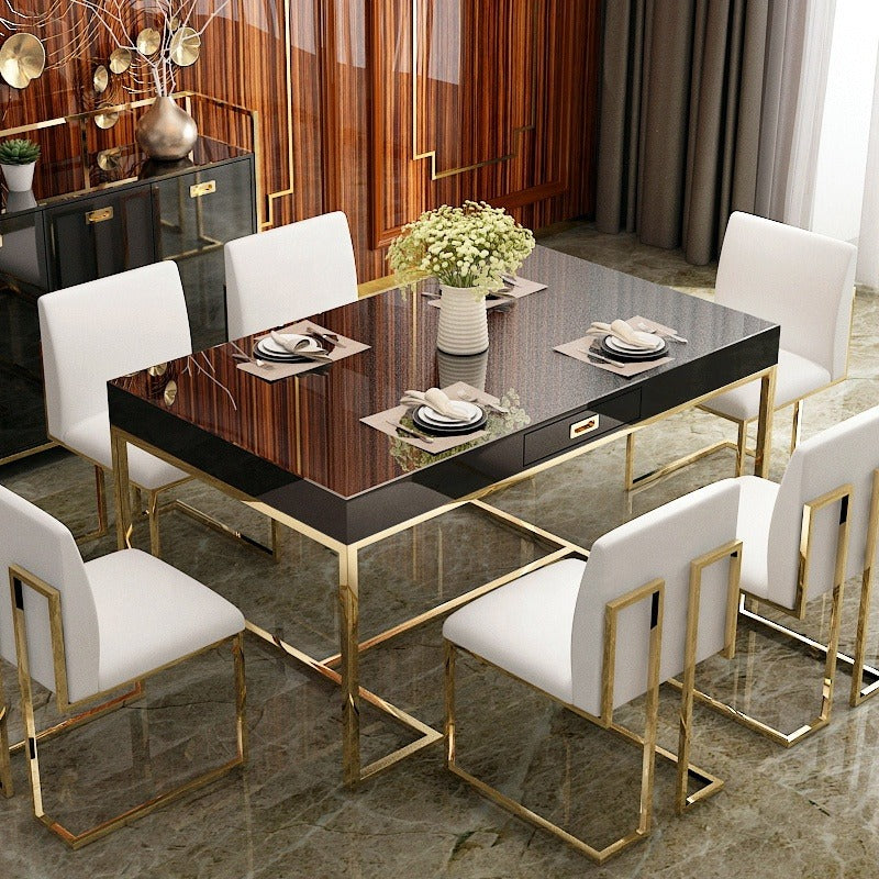 Mobilier de salle à manger familiale, design classique moderne et épuré, table à manger en verre trempé.