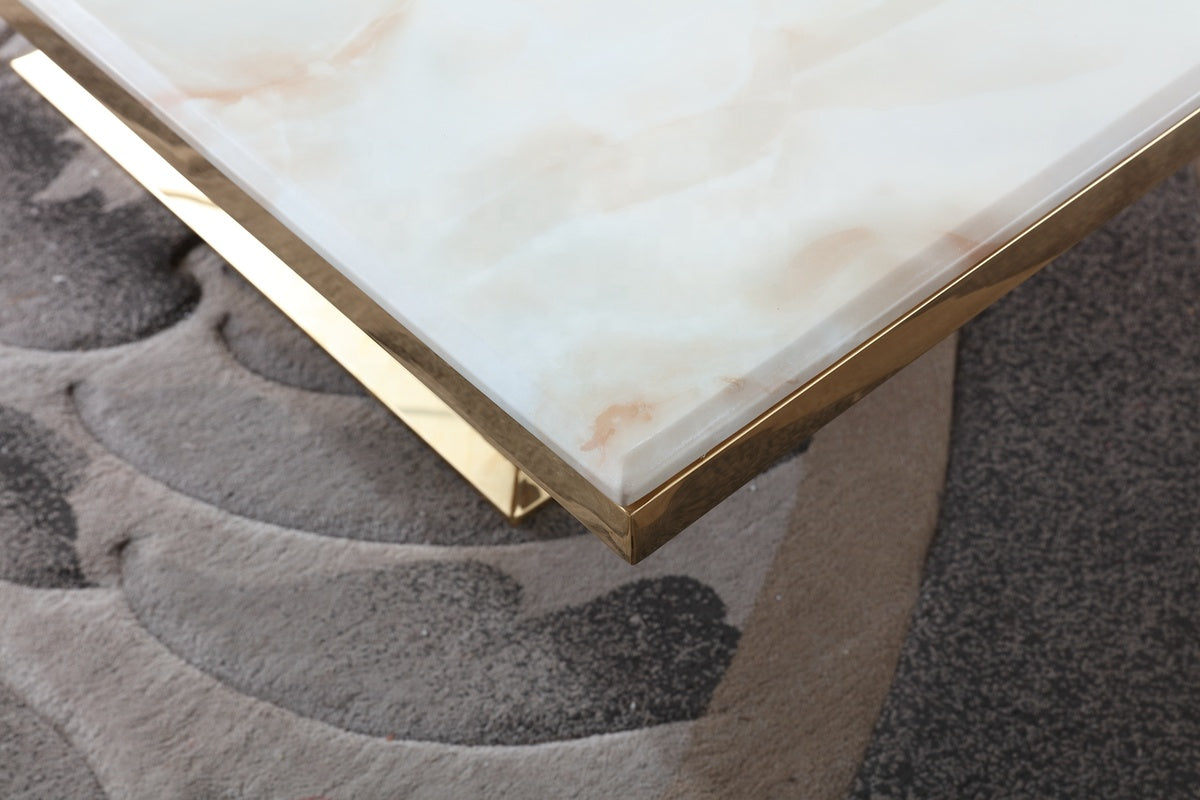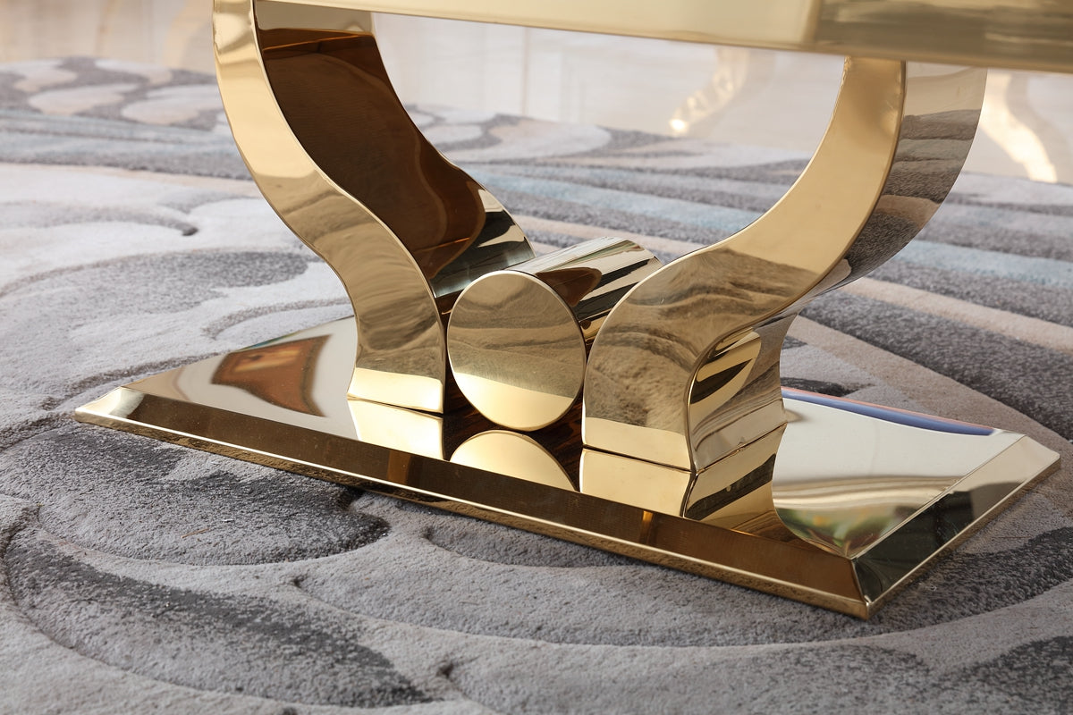 Salon contemporain de luxe avec plateau en marbre, structure centrale en acier inoxydable doré et verre