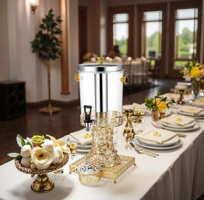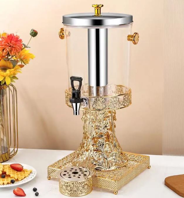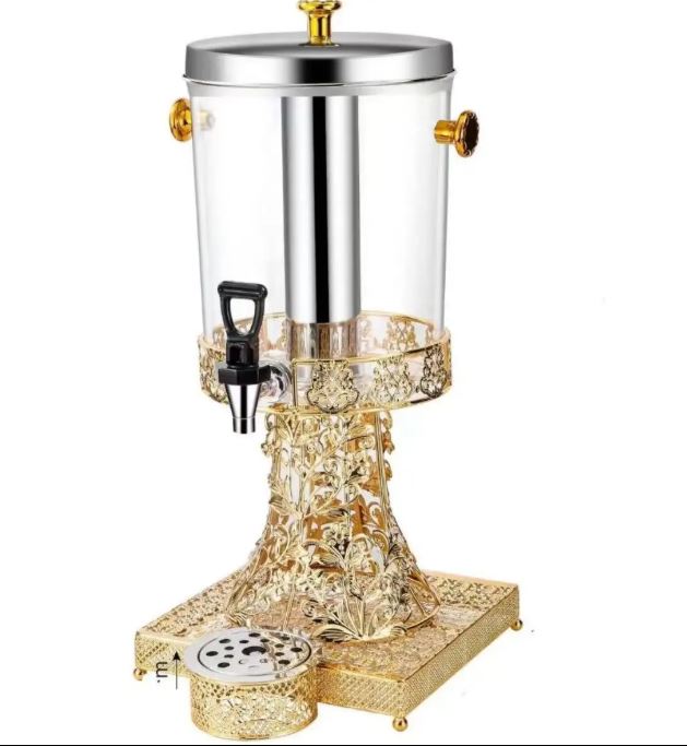 Distributeur de boissons de luxe en acier inoxydable 8L, base dorée, robinet de fête. Matériaux : plastique et acier inoxydable.