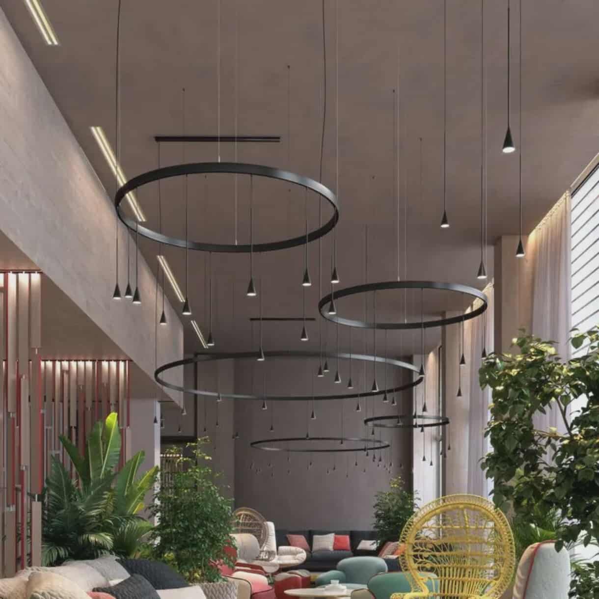 Its minimalist circular form and balanced proportions make it an ideal choice for both residential and commercial spaces. The multi-ring LED lighting provides soft, even illumination while enhancing the overall ambiance with a clean, elegant aesthetic. Perfect for open spaces, meeting rooms, and luxury dining areas, this chandelier brings a refined yet modern touch to any environment.