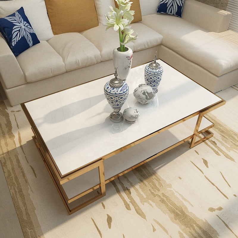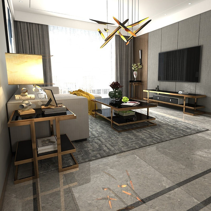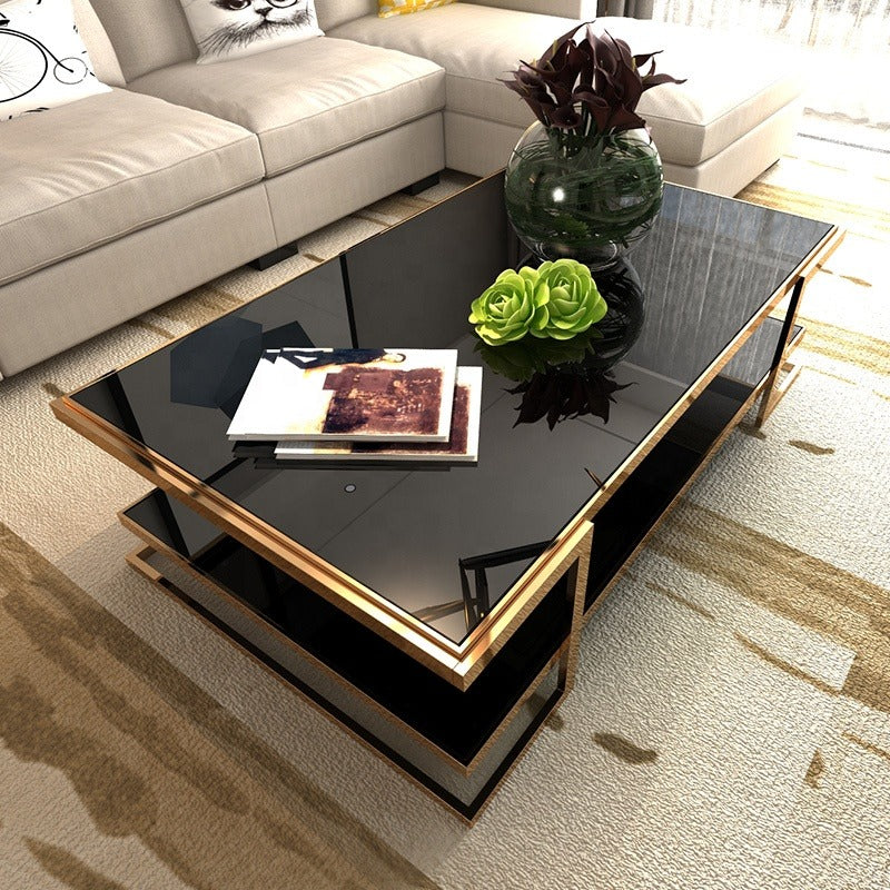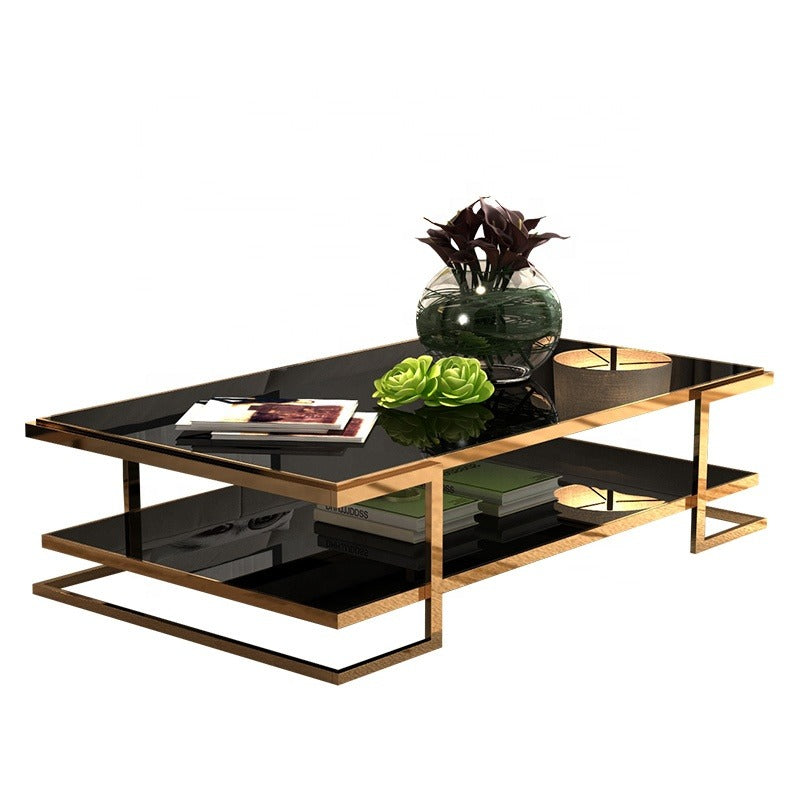 Table basse moderne et luxueuse, style salon, en acier inoxydable et verre.