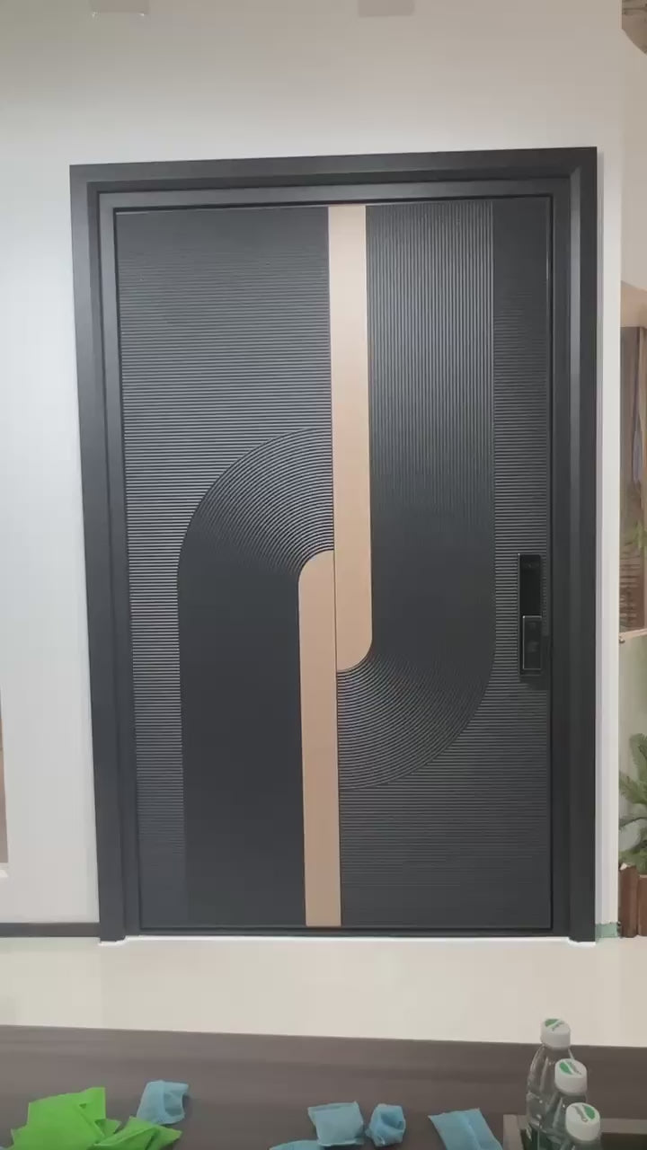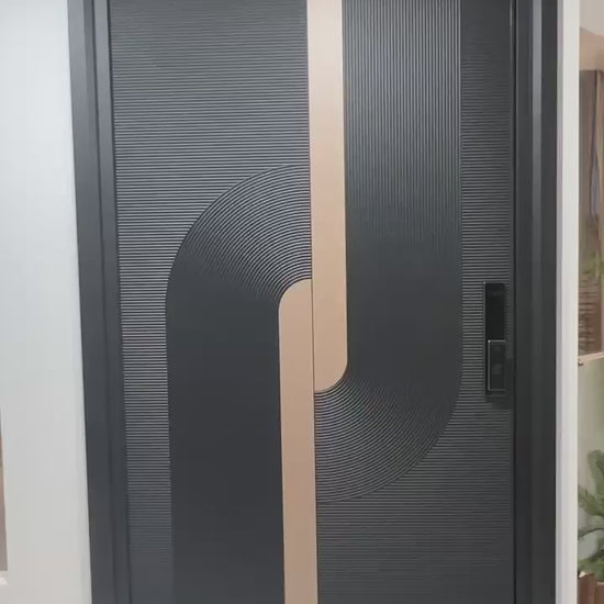 Modern Luxury Customize Main Door with Fingerprint Lock | High-Quality Metal Construction | Matte Black & Gold Finish | Textured Grooved Panel Design | Digital Smart Lock System | Contemporary Aesthetic