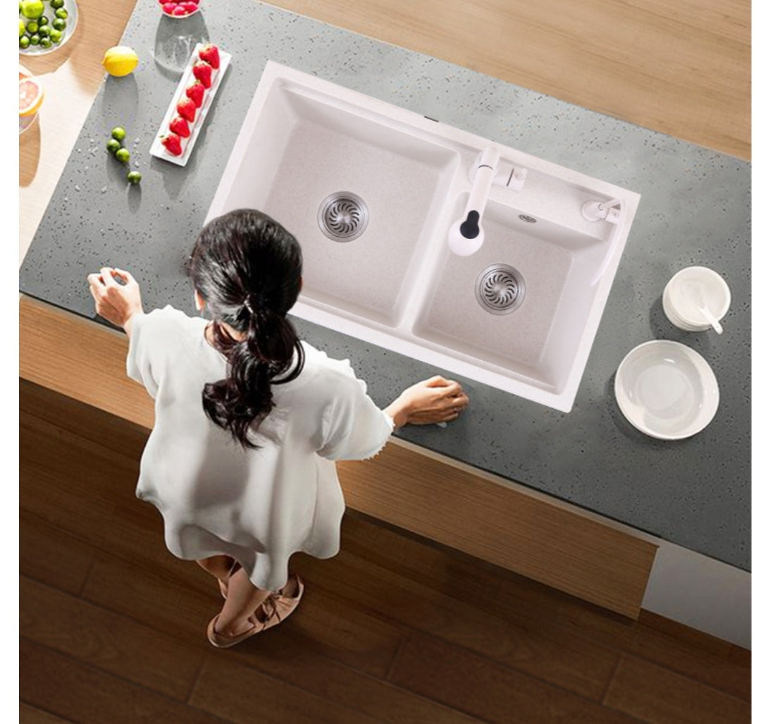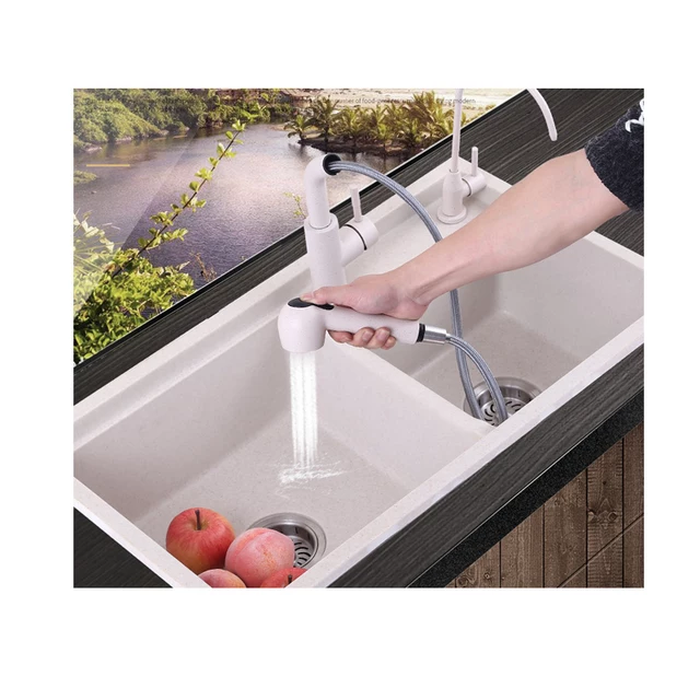Évier de cuisine en pierre de quartz avec robinet double blanc perle inclus