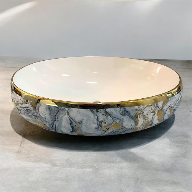 This luxurious vessel sink features a sleek white interior with a striking marbled exterior accented by elegant gold detailing, creating a sophisticated statement piece for any bathroom. Crafted from high-quality ceramic, its modern design seamlessly blends functionality with artistic charm.