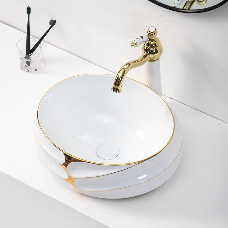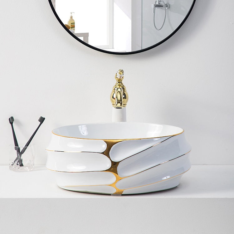 Decorative Oval Countertop Bathroom Sink White and Gold Porcelain Art Basin Hand Face Wash Basin for Hotel Vanity