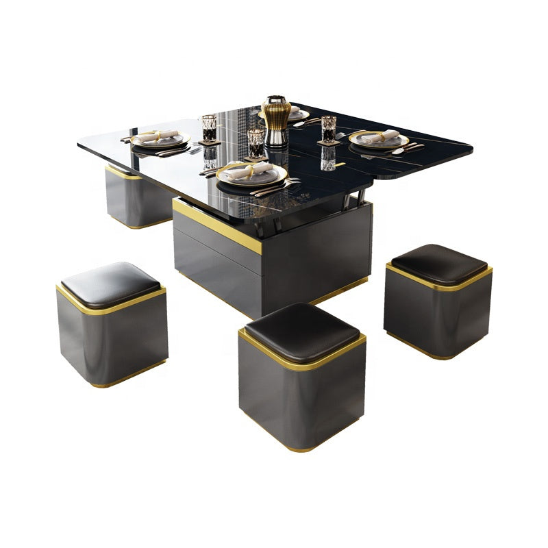 Luxury multifunctional lifting marble black coffee table with 6 stools