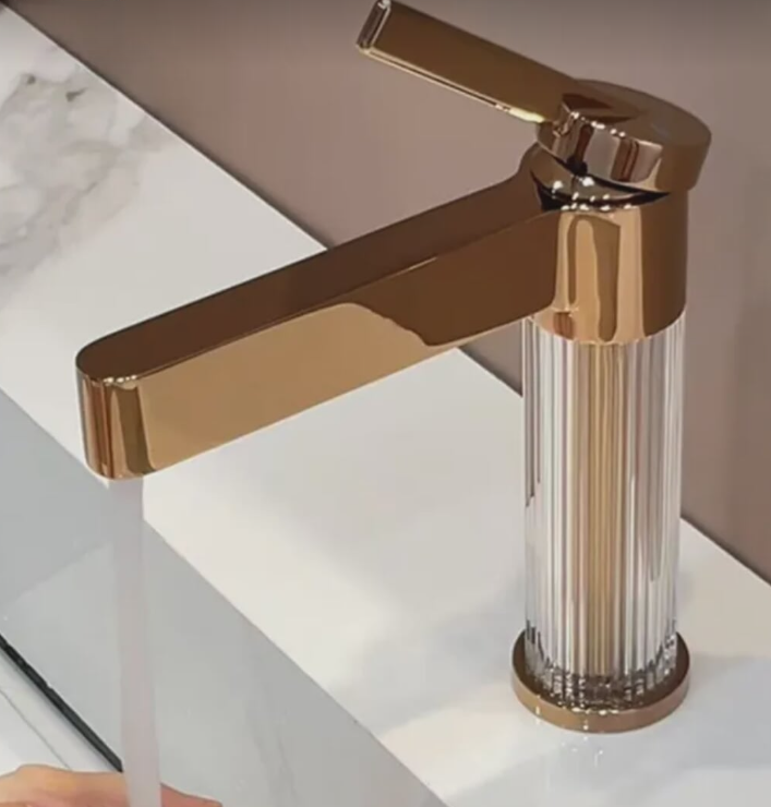 • Elegant luxury bathroom faucet with a rose gold brushed brass finish