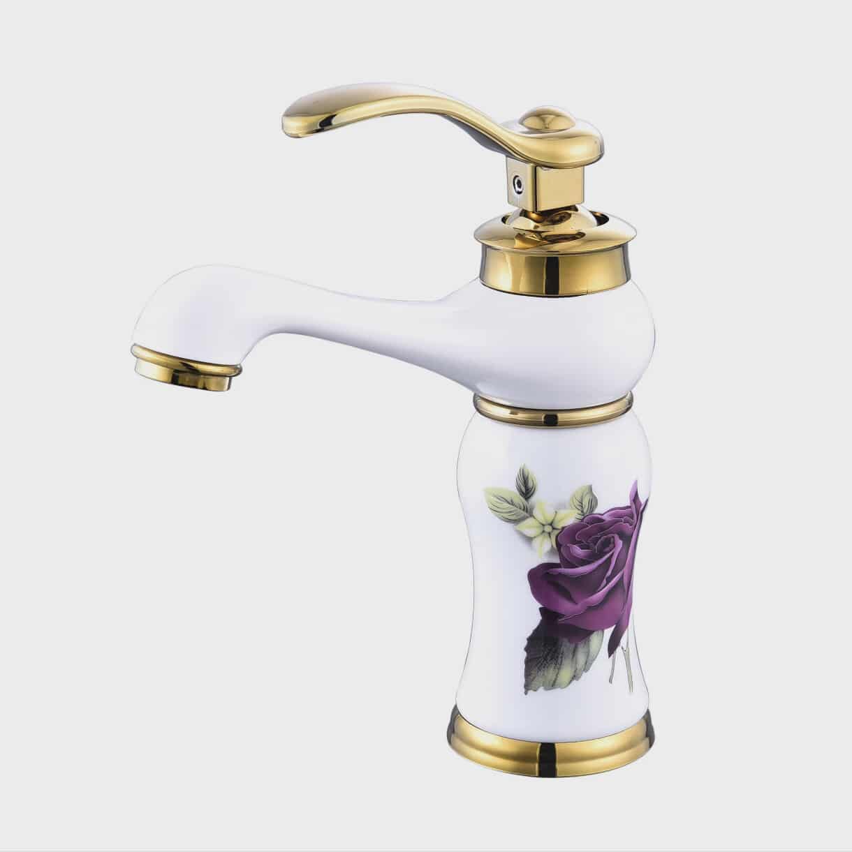 Elegant white ceramic faucet with premium gold trim accents Features a beautiful purple rose floral design for a decorative touch... Read more