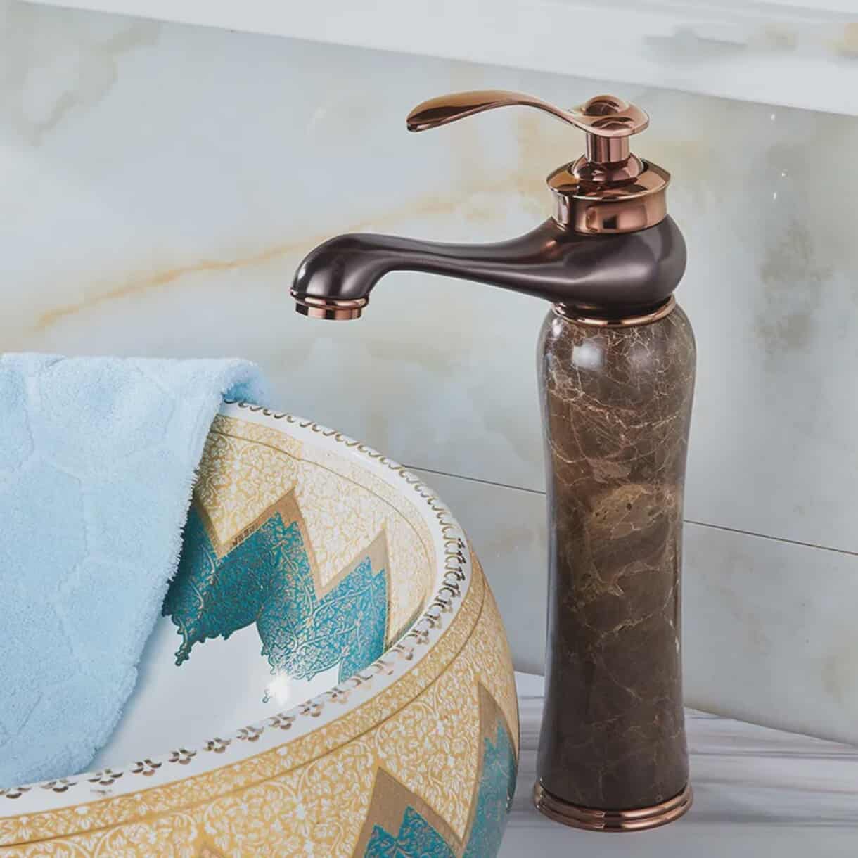 Tall Brown Brass Bathroom Faucet with Marble Base – Luxury Modern Design