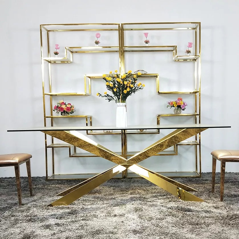 X Legs Stainless Steel Wedding Dining Table Glass Top 6 seaters
