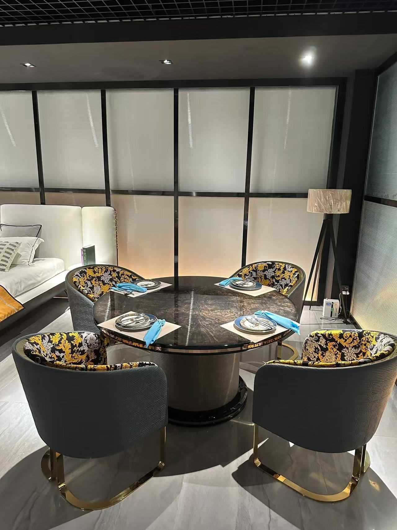 Black Round Dining Table with Black Marble Top Stainless Steel , Marble ,Leather with Gold Accents and Luxurious Upholstered Chairs Featuring Intricate Black and Gold Patterned Fabric