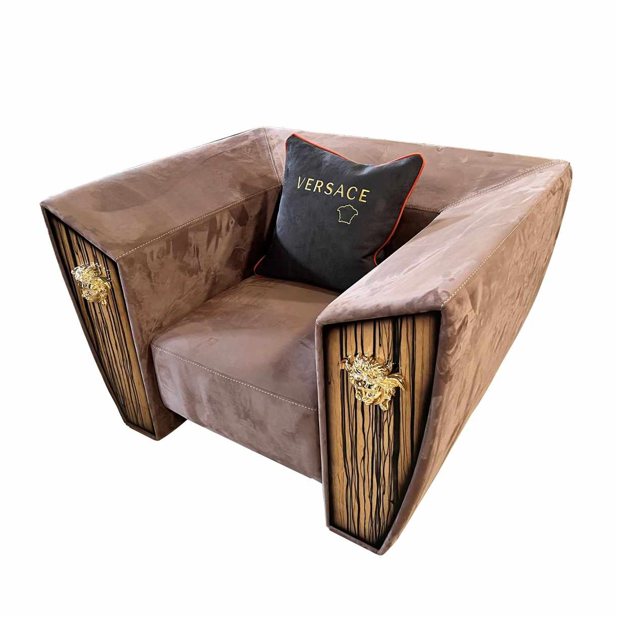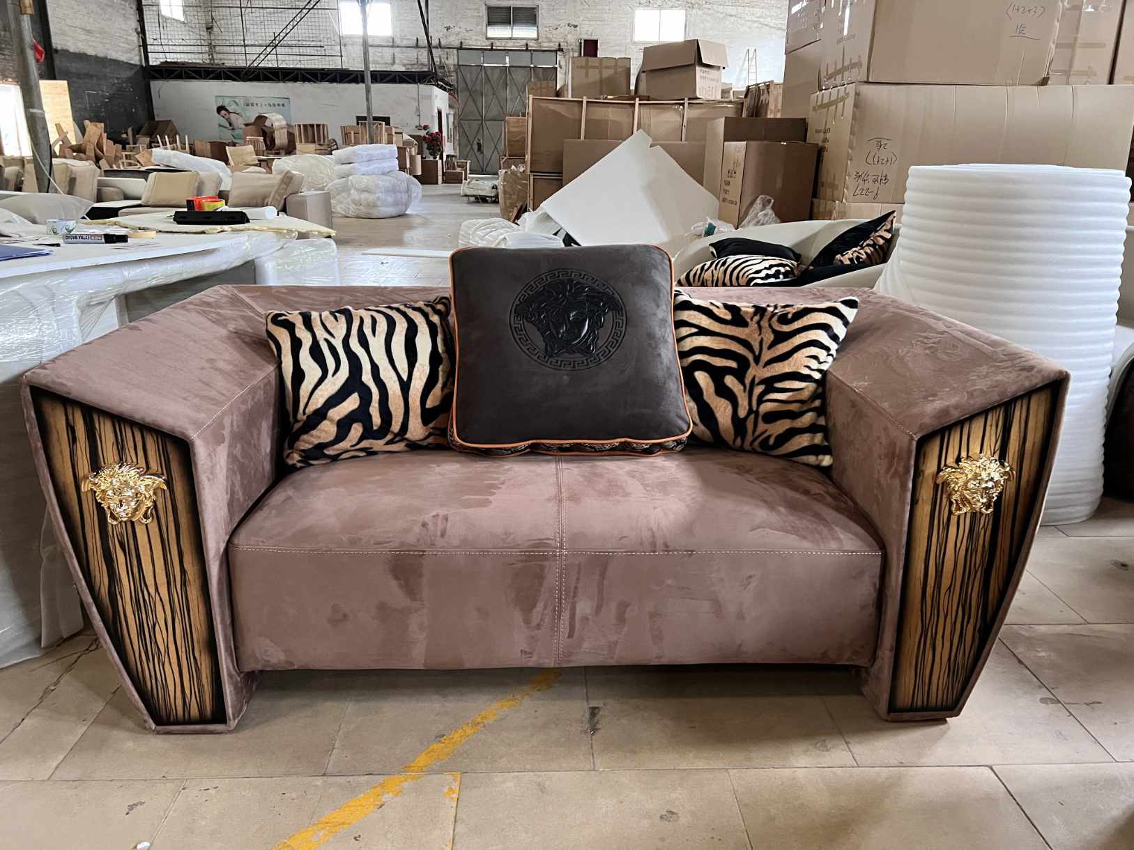 Modern Fusion of Plush Mauve Velvet, Zebra-Print Accents, and Art Deco-Inspired Wood Paneling with Lion Head Hardware