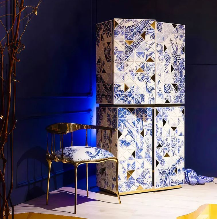 Luxury Italian Sideboard Cabinet –Modern Solid Wood & Metal Wine Cabinet Triangle Parquet Art