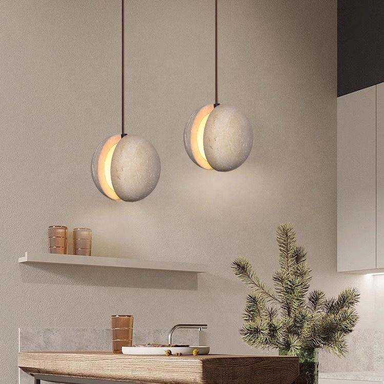 Travertine Stone Pendant Light – LED Hanging Ball Chandelier for Kitchen Island & Dining Spaces